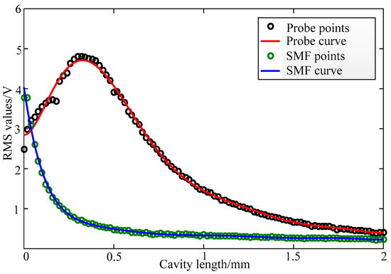 The novel F–P interferometer based on the ultra-small GRIN fiber probe and the ordinary F–P interferometer based on the single-mode fiber (SMF) were then experimentally compared. The output voltage of the interferometers was measured and the RMS (root mean square) value was calculated. Figure 8 shows the RMS value of two F–P interferometers varying in cavity length. The black circles are the RMS sample points of the novel F–P interferometer, and the red curve is the RMS curve obtained by fitting its sample points. The green circles are the RMS sample points of the ordinary F–P interferometer and the blue curve is the RMS curve obtained by fitting its sample points. It can be seen from Figure 8 that within the range of a 2 mm cavity length, the RMS value of the novel F–P interferometer first increases and then decreases with a maximum of 4.8 V. The RMS value is higher than 2 V in the range of a 0.8 mm cavity length. The root mean square value is 3.9 V at the working distance of 0.506 mm. For the ordinary F–P interferometer, the RMS value decreases monotonically and obtains its maximum of 4 V at the beginning. In the range of 0.1 mm cavity length, the RMS value is higher than the novel F–P interferometer. After that, the RMS values of the SMF F–P interferometer were relatively lower than those of the novel F–P interferometer. When the cavity length was increased to 0.2 mm, the RMS value decreased to 1 V. Therefore, the F–P cavity of the novel interferometer can be set to 0.5 mm, while the length of the F–P cavity of the ordinary SMF interferometer is about 0.1 mm, less than 0.5 mm. This further proves that the F–P interferometer based on the ultra-small GRIN fiber probe has superior focusing performance and a large dynamic measurement range.