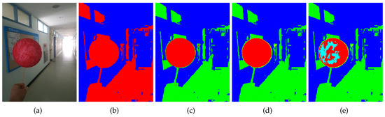 Color-based pixel clustering example. (a) Input color image. (b) and differently color-coded. and are colored in red and blue, respectively. (c) , , and colored in red, blue, and green, respectively. (d) , , and , colored in red, blue, green, and yellow, respectively. (e) , , , , and colored in red, blue, green, yellow, and cyan, respectively.