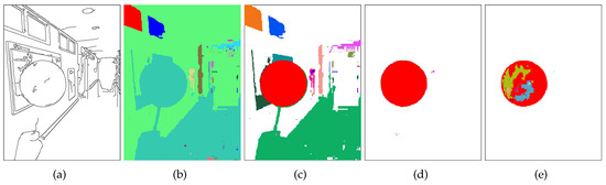 Edge pixels and connected components. (a) Edge image of Figure 3a. (b) Connected regions detected in and , differently color-coded. (c) Connected regions detected in and . (d) Connected regions detected in and . (e) Connected regions detected in and .