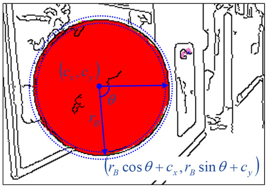 where is a quantized angle ranging from – with resolution and is increased from – to find a boundary pixel within a one-pixel range from . Here, is set to the smaller value between and to discourage small nonexistent circles from being detected. is the distance from the boundary pixel to its nearest edge pixel. The boundary pixel is not always unique for a pair of and ; this is why we compute the minimum value in Equation (7). For some , there may be no boundary pixel within the range of . In this case, we set to . Figure 5 illustrates an example of a boundary pixel for a pair of and . As shown in the figure, both boundary pixels and edge pixels tend to be near the circumference if the region is circular. The proposed circle detection algorithm is summarized in Algorithm 2.