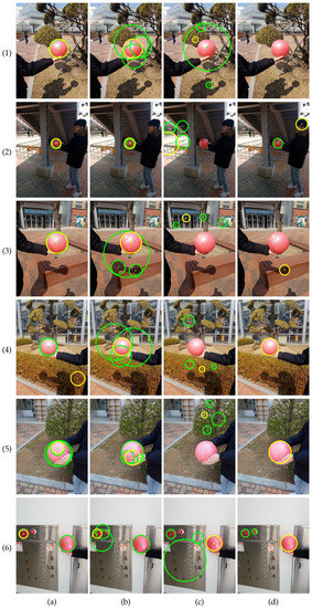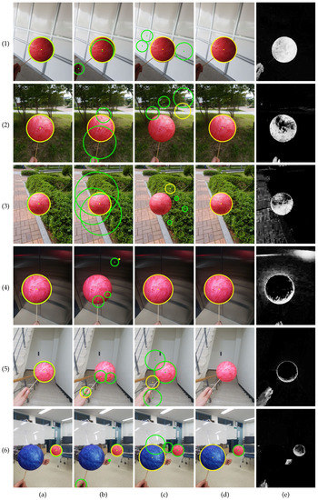 Assuming a studio or laboratory environment, it is possible to control lighting or the environment. However, the background subtraction algorithm may fail to reduce the search region if the environment contains objects of similar color to the sphere or is under nonuniform lighting conditions. If the sphere’s color is not distinct from the background, the color distribution-based methods [15,20,21] may also fail.