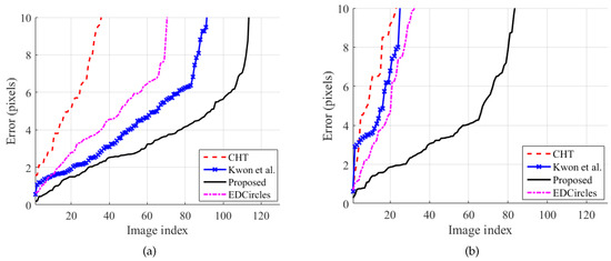Figure 6 shows the accuracy of the methods on the styrofoam ball set. The error in the figure is the distance from the best circle center detected by a method to its manually-recorded ground-truth center. Considering that the manually-recorded center locations will have errors from the human operator, the proposed method provided accurate results for all test images with a maximum error of 10 pixels. EDCircles gave similar results to the proposed method for most of the images. In Figure 6a, it can be seen that the horizontal length of the EDCircles’ curve is shorter than the others because of its false rejection ability.