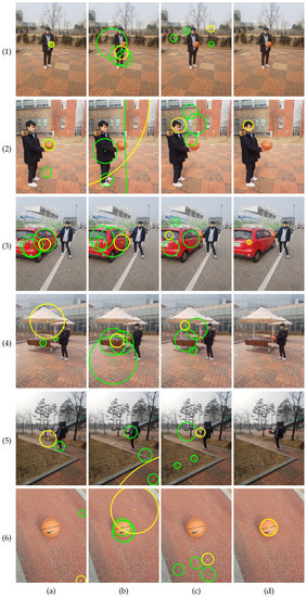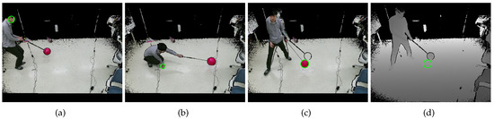 The second set was a dynamic set collected by capturing videos of the styrofoam ball carried by a person. The set consisted of 164 color and depth image pairs per camera (), with tens of missing spheres and misdetected spheres. Figure 13 shows examples of misdetected spheres. In the color space, the skin color is similar to the color of our sphere. In addition, the face and hand seem circular from a distance. Therefore, the proposed method sometimes mistook the face and hand as the sphere, as shown in Figure 13a,b. Another source of error is the asynchronous nature of the Kinect v2 camera, as shown in Figure 13c,d.