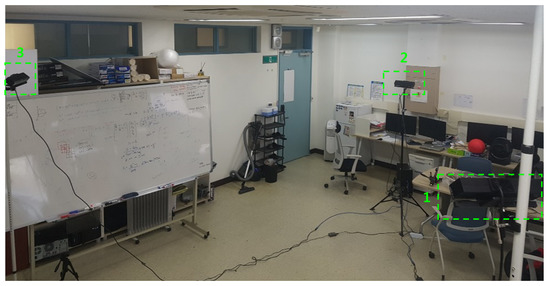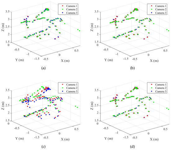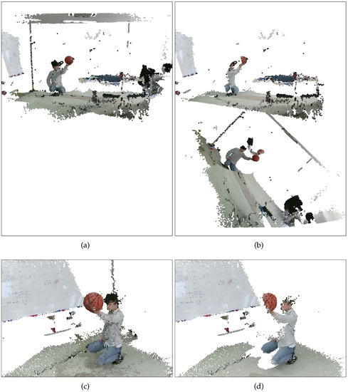 As shown in Figure 12, our capturing system consists of three sparsely-placed Kinect v2 cameras surrounding the middle of the room. All three cameras were connected to a single computer with an Intel Core i7-4790 processor and 8 GB of RAM, running Windows 10. We let three threads capture three pairs of color and depth images simultaneously; however, perfect synchronization could not be achieved due to the asynchronous nature of Kinect v2 cameras, as shown in Figure 13c,d.