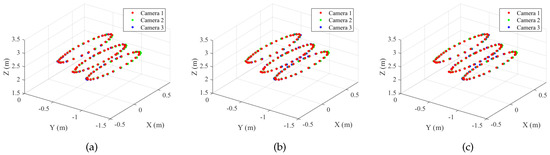 Figure 14 shows the trajectories of the sphere centers of the static set. For each method, all the sphere centers in camera q have been transformed to the reference frame. As shown in the figure, the pairwise pose estimation (pairwise) and bundle adjustment (BA) of the proposed method registered the trajectories from different cameras accurately. Su et al.’s method also showed the same alignment as BA.