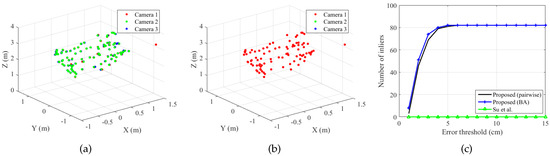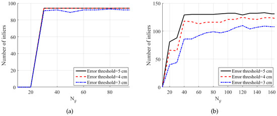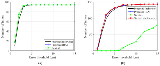 Figure 16b shows the number of inliers of the dynamic set. The proposed method (BA) and Su et al. (inlier set) showed similar results, while the original Su et al.’s method showed only a small number of inliers, even with large error thresholds.