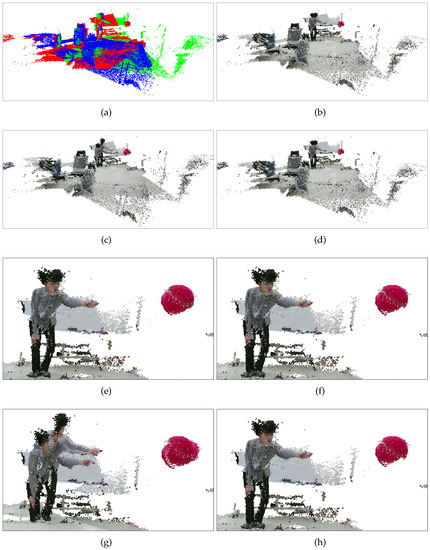 Figure 18 shows the fused 3D point clouds attained by the methods. The depth images fused together are from the dynamic set. The proposed methods (pairwise and BA) and Su et al. (inlier set) show visually similar results, while Su et al. fails in aligning the point clouds, as shown in Figure 18c,g.