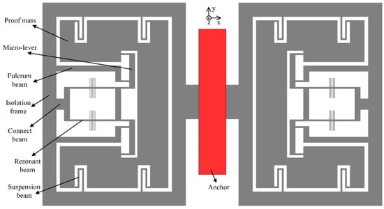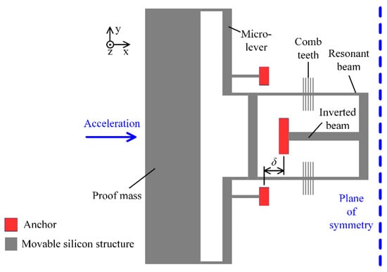 The structure of our MRA is fully symmetric and half of the schematic structure is illustrated in Figure 1. The movable silicon structure is bonded to a glass substrate via a set of anchors. The input acceleration along the sensitive axis (x-axis) will make the proof mass displace away from its nominal position. Then the inertial force is amplified by the micro-lever system in order to achieve high sensitivity. Finally, the double-ended tuning fork (DETF) resonator in Figure 1 is stretched, which will increase its natural frequency. On the other hand, the symmetric DETF is compressed and its natural frequency will be decreased. Within a certain measurement range, the differential frequency of the two resonators is proportional to the input acceleration. This differential output will cancel most of the common error sources of the two resonators. Note that the two resonant beams in each DETF vibrate in reversed-phase mode, which can improve the Q-factor of the resonators.