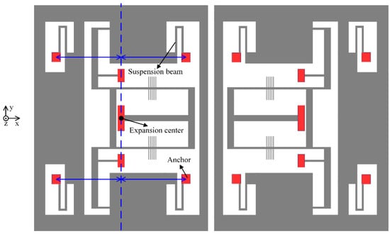 In the first design, the locations of the bonding anchors are optimized to decrease the thermal stress between the glass substrate and the silicon structure. In principle, the thermal stress coefficient (k) is dominated by δ. If δ = 0, which can be implemented by using an inverted beam design (as shown in Figure 1), the thermal stress along the acceleration-sensitive axis can be decreased greatly. On the other hand, the layout of the suspension beams also influences the thermal stress. The four anchors of the suspension beams should be arranged symmetrically, relative to the expansion center, and be close to each other. Improved structure design is illustrated schematically in Figure 2, where the condition δ = 0 holds.
