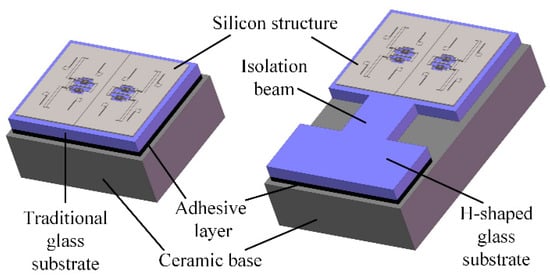 In addition, a dedicated H-shaped isolation structure is proposed to reduce the thermal stress produced by the adhesive layer during the die attach process, as shown in Figure 3. Compared with a traditional rectangular glass substrate, the H-shaped glass substrate has a narrow isolation beam. One side of the H-shaped substrate is attached to the ceramic base via adhesive. The other side, which provides the bonding area of the silicon structure, is separated from the adhesive layer by the isolation beam. In this way, the silicon structure and the glass substrate below can virtually expand or shrink freely without the constraint of the ceramic base.
