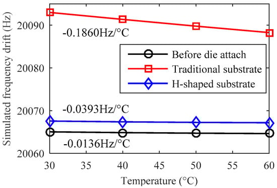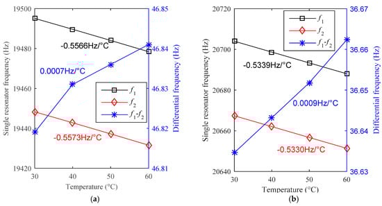 In designs A and B, the frequency drift caused by the Young’s modulus itself is simulated to be −0.5598 Hz/°C. This will dominate the total temperature drift of each single resonator. Benefiting from the full symmetric design of two resonators, the temperature drift of the differential frequency output will be reduced greatly.