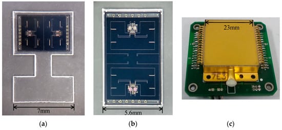 Photographs of the fabricated devices: (a) the structure in design A, (b) the structure in design B, (c) the vacuum packaged MRA device on the interface circuit board.