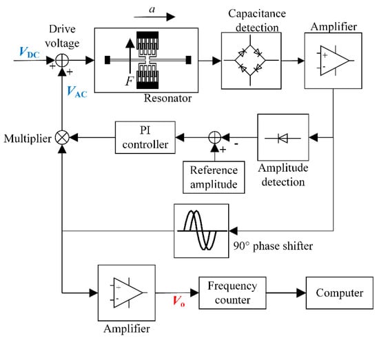 The block diagram of the interface electronics is shown in Figure 10. The vibration of the resonator will cause the change of the capacitance between the comb teeth. Then the differential capacitance is detected by a ring-type diode based demodulation circuit [30]. The vibration amplitude is stabilized by automatic amplitude control (AAC). With a 90° phase shifter, the self-oscillation loop is established so the resonator will be locked at its resonant frequency. The frequency signal is captured by a commercial frequency counter (53230A, Keysight Technologies, Santa Rosa, CA, USA) and recorded by a computer in the following tests.