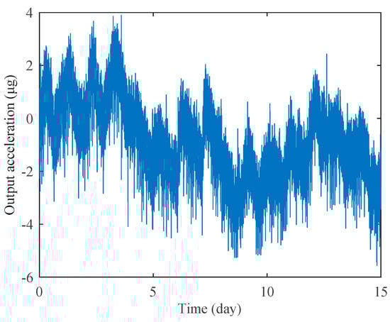 Long-term bias stability is one of the most crucial performance requirements for high-precision accelerometers. We have recorded the bias stability of the prototype A1 for 15 days, as shown in Figure 12. The device is mounted at 0 g position and the test environment is under room temperature. The frequency output is acquired at a sampling rate of 1 Hz, where no temperature compensation or data smoothing is used in the plotted curves. After the MRA reached thermal equilibrium within two hours, the continuous measurement lasted 15 days. The standard deviation of the 15-day data is 1.4 μg, which is the lowest bias stability ever reported for MEMS accelerometers without temperature compensation or temperature control. The measured results indicate that the MRAs presented in this work exhibit expected temperature-insensitive characteristics and excellent long-term stability.