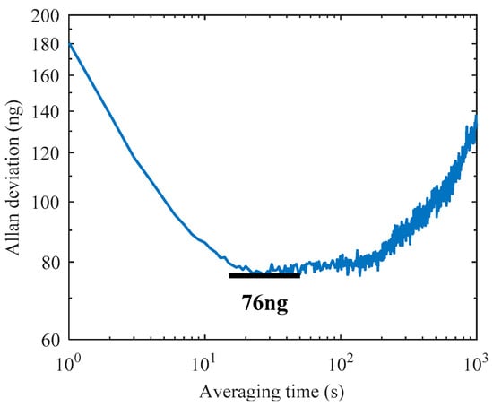 The Allan deviation is a generally used method to evaluate the noise and drift error of various accelerometers. The minimum of the Allan deviation indicates the bias instability which limits the attainable resolution of the device. Along with the low noise design [31], the MRA shows high overall performance in Allan deviation measurement, as shown in Figure 13. The sampling frequency is set at 1 Hz and the total number of recorded data points is 60,000. The result shows a bias instability of 76 ng at 27 s averaging time, which is the best bias instability among reported MEMS resonant accelerometers.