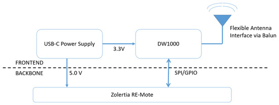 The hardware platform is made up of a UWB RF front end and a sub-GHz backbone (Figure 2). The RF front end consists of the DW1000, the necessary pheriperal circuits, and a power connection. For the sub-GHz backbone, an existing low-cost IoT board, the Zolertia RE-Mote [23], is used. The choice for the Zolertia RE-Mote for the backbone is based on several arguments. First, the board is an existing, of-the-shelf IoT platform with widespread software support from both Contiki OS and openWSN. The RE-Mote has on-chip support for two popular, low-power IoT transceivers: the CC1200 long-range, sub-GHz communication (820–950 MHz) and the CC2538 for low-power, short range communication in the 2.4 GHz bands. Furthermore, the TAISC framework is available for the RE-Mote, and it supports SPI communication with the DW11000.