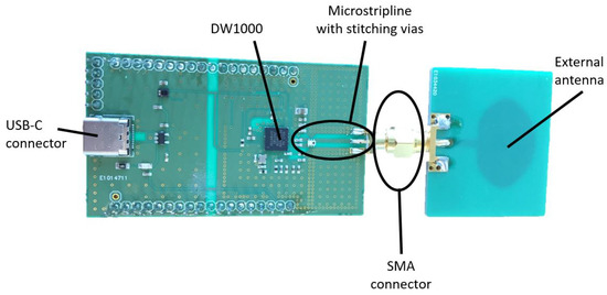 - Flexible interfacing with external UWB antennas gives the opportunity to optimize the antenna system for the intended use case. The localization of assets can benefit from the use of dedicated impulse radio (IR)-UWB antennas [3,4,5]. The performance of different antenna designs can be evaluated with the flexible antenna interface.
