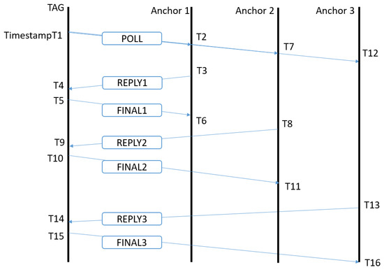 Asynchronous two-way ranging scheme of the UWB packets for a three-anchor system. Only one poll is sent from the tag and shared over the different anchor nodes.