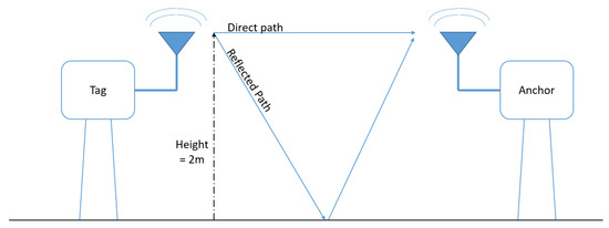 Ground reflection model: Interference will occur at the receiving antenna between the direct, LOS, path, and other (reflected) paths with different lengths from sender to receiver. In the ground reflection model, the interference between the most important reflection path and the direct path is taken into account (see Figure 8). The difference in path length will result in distances where both signals will interfere constructively, increasing the receive power, or destructively, where they cancel each other out. The separations between sender and receiver where the signals interfere destructively are dependent on the center frequency of the UWB ranging and the height of the antenna nodes.
