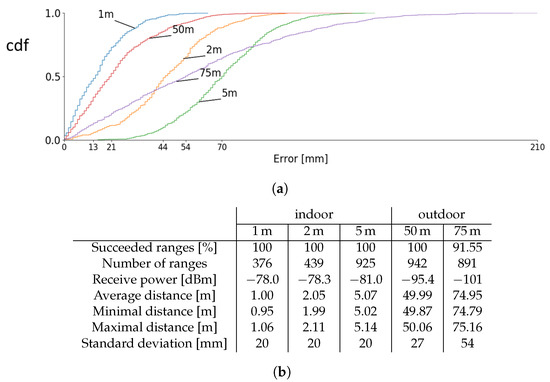 Longer range measurements were performed on an empty parking lot. Test samples were recorded at two fixed distances (50 and 75 m) at 2 m height, and the cumulative distribution of these experiments is given in Figure 9a. The statistics of these measurements are given in Figure 9b. The mean reported distances are 49.99 and 74.95 m, deviating only 1 and 5 cm from the real distance. The mean receive power at 75 m is −101.08 dB m, resulting in a packet receive ratio of 91.55%. The precision for the measurements at 1, 2, 5, and 50 m is very similar while the precision for 75 m is much lower due to the small link margin at 75 m. Ranging in indoor environments are typically more challenging than in open space. Reflections from ground, walls, objects, and ceiling will interfere at the receiver’s antenna influencing the signal strength level of the received packet.