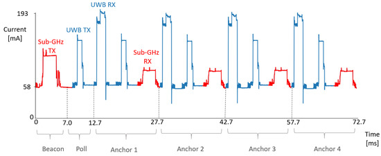 One of the critical properties of a mobile localization system is the power consumption. For the Wi-PoShardware, the total power consumption is measured over the USB-C connector when the node is used as tag and as anchor. The current is measured with the N6705 DC power analyzer system [33] at a 10.24 μs sampling interval. A typical current profile for a tag node is given in Figure 11. When the device is in IDLE mode, the current flowing into the node is 58.26 mA, where changing the state of the DW1000 from IDLE to INIT can reduce to current to 44.26 mA. In the beginning of the superframe, the tag will send out a sub-GHz packet, followed by a UWB POLL message (broadcast to all four anchors). Next, one UWB packet is received, one UWB packet is sent, and one sub-GHz packet is received for each anchor before the superframe ends at 72.7 ms. Each anchor replies in its specified time slot. The DW1000 at this tag node is first put in receive (RX) mode and afterwards in transmit (TX) mode. After completion of the UWB message handling, the sub-GHz report is sent, and a smaller peak in current consumption can be noticed. Anchor nodes that currently are not ranging with the tag put the UWB radio in the INIT state, and the node only listens on the sub-GHz spectrum, reducing power consumption in localization systems.