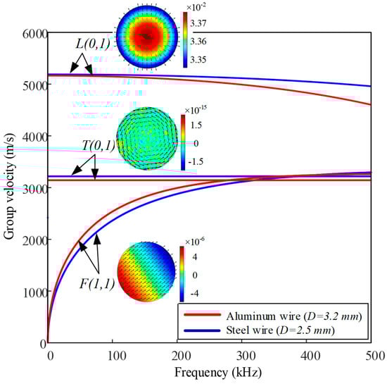 The group velocity dispersion curves of individual steel wire with a diameter of 2.5 mm and aluminum wire with a diameter of 3.2 mm were acquired using a software package named PCDISP written in the Matlab (MathWorks Inc., Natick, NA, USA) environment, as shown in Figure 2. PCDISP is described in more detail in [52,53]. The material and geometric properties used in the dispersion models of PCDISP are summarized in Table 1.