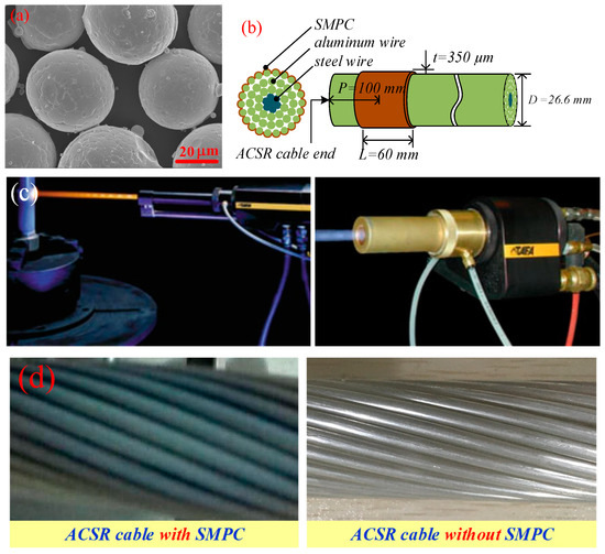 (a) Scanning electron microscope (SEM) micrograph of the Fe83Ga17 gas-atomized powder; (b) diagram of sprayed magnetostrictive powder coating (SMPC); (c) Photo of the spraying system; (d) aluminum conductor steel-reinforced (ACSR) cable with and without SMPC.