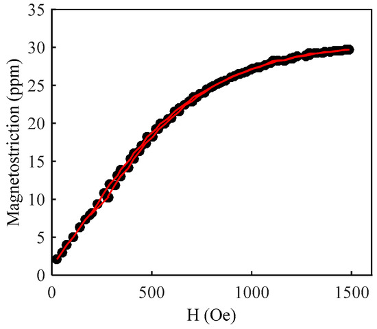 In order to evaluate the magnetostriction of the SMPC, the same sprayed system and parameters were employed to spray a coating on an aluminum plate with a thickness of t = 350 µm. A resistance strain gauge positioned along the coating plane with a gauge area of 2.8 × 2.0 mm2 (base area of 6.4 × 3.5 mm2) was used to measure the magnetostriction. The magnetostriction of the as-deposited coating reached 30 ppm under a maximum external magnetic field of 1500 Oe at room temperature, as shown in Figure 4.