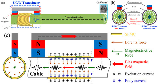In a non-ferromagnetic conductive material subject to a static bias magnetic field, an applied dynamic magnetic field induces the Lorentz force [55] within it, thereby generating mechanical guided waves. In the case of a ferromagnetic material, an applied magnetic field induces magnetostriction [56] as well as the Lorentz force.