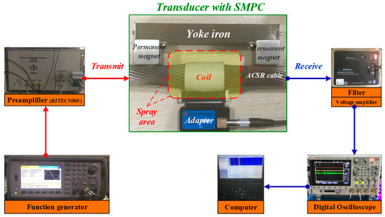 The coatings were uniformly deposited to a thickness of t = 350 µm on the outermost aluminum wire surfaces of the cable, as shown in Figure 3b. In order to compare the magnetostrictive energy conversion performance of the SMPC, only one cable end was sprayed, as shown in Figure 3d. The length of the SMPC (L = 60 mm) was slightly wider than the width of the UGW transducer coil used in the follow-up experiments. To facilitate transducer installation, the distance from the center of the spray area to the wire end was P = 100 mm.