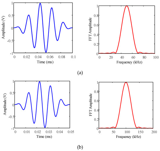 Excitation signal and fast Fourier transform (FFT) spectra of Hann-windowed 5-cycle (a) 50 kHz and (b) 100 kHz sinusoidal tone bursts.