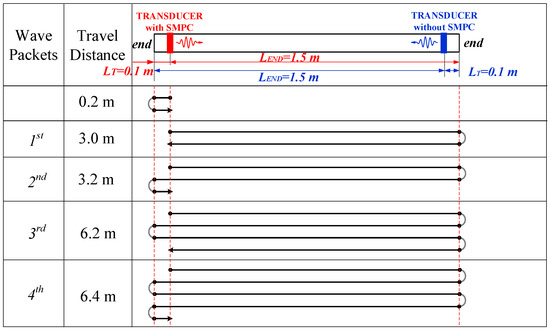 Two sets of experiments were conducted on the 1.6 m long ACSR cable described in Section 2.1. The UGW transducers (with and without the SMPC) were placed respectively close to the two ends of the cable with a distance of LT = 0.1 m. The distance from the transducer to the far end was LEND = 1.5 m. The propagation paths of guided waves associated with the configuration of transducers are shown in Figure 8. The figure shows all the propagation paths of the guided waves excited by the transducer with SMPC. They are similar to the transducer without SMPC, since the distances of the two transducers between the installation locations and cable ends were the same.