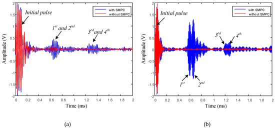 The first portion of received signals consist of the initial electromagnetic pulse and superposition of the near-end reflection wave. The other four wave packets correspond to the multiple-end reflected waves with various acoustic travel paths, as summarized in Figure 8. The temporal resolution of guided wave detection increases as the excitation frequency increases, since the higher the frequency, the shorter the wavelength. All four wave packets can be clearly distinguished in the signals (transducer with SMPC at 100 kHz excitation frequency) in Figure 9b corresponding to the propagation paths of the guided waves. However, in Figure 9a, the first and second wave packets are difficult to distinguish, as are the third and fourth wave packets.