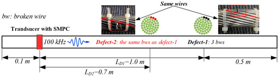 In order to investigate the applicability of the UGW transducer with SMPC to detect defects in the ACSR cable, artificial defects were made on the cable used in the previous experiments. The experiments of defects detection were carried out in two stages, as shown in Figure 10. Each stage of broken wires is summarized as: