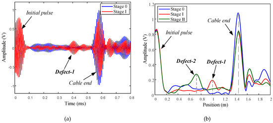 Reflected waves received by transducer installed on ACSR cable with artificial defect: (a) time domain signals; (b) Hilbert envelope signals.