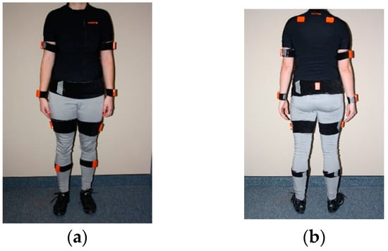 Briefly, each sensor unit provides estimation of the orientation of body segments relative to a global reference [18,19]. Alone, each sensor provides biased information under certain circumstance, but putting them together (sensor data fusion) allows their limitations to be overcome and provides more accurate sensor orientation. Then, this can be used to calculate 3D joint angular kinematics. To achieve this, accurate M/IMU orientation has to be obtained by performing an anatomical calibration which allows an accurate joint angle calculation [20]. This procedure ensures quality of the data collected and should be carefully considered when using M/IMU systems. See Figure 1 for an example of a typical M/IMU sensor placement.