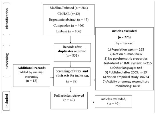 Five databases were screened (PubMed, CinAHL, Ergonomic abstract, Compendex, and EMBASE) using a combination of general keywords and specialized terms for each database. General keywords were: (“psychometric property” OR “reliability” OR “validity” OR “accuracy” OR “precision”) AND (“inertial measurement unit” OR “wearable sensors” OR “inertial sensor” OR “accelerometry”) AND (“joint angle” OR “range of motion” OR “movement” OR “kinematic”). Bibliographical references of the retrieved studies were also searched to identify additional relevant publications. Specialized keywords are presented in Table S1.