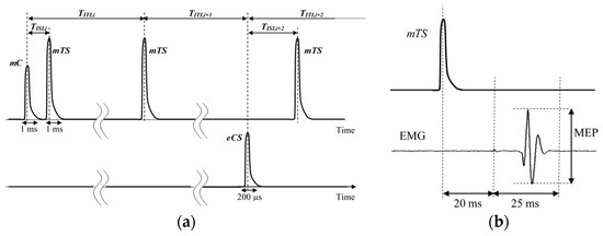 (a) Example of a set of three stimulus trains in a diagnosis protocol: train i is MM, train i + 1 is REF and train i + 2 is EM. The width of magnetic stimuli is usually 1 ms, whereas the width of electrical stimuli is 200 µs. TISI is usually between 1 ms and 100 ms, whereas TITI is on the order of few seconds. (b) Time diagram of mTS and successive EMG signal, with the quantity of interest (MEP).
