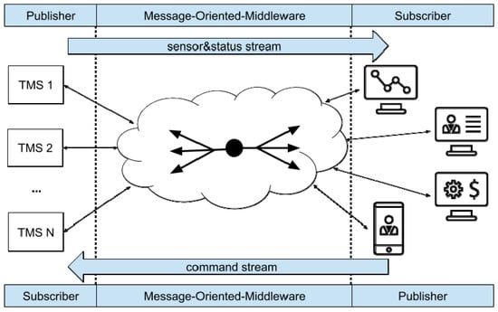 In order connect the TMS-based prototype instrument to the cloud, some kind of “horizontal integration” must be provided, typically in the form of middleware. In particular, smart medical devices and operators should be able to enter and leave the infrastructure as desired. The typical approach is the adoption of a message oriented middleware (MOM) based on a publisher/subscriber protocol, in which nodes announce their new data and others can selectively subscribe to them. Some standardization efforts for providing a common platform have been carried out. In the past, the IEEE11073 has been created aiming at standardizing data formats for point-to-point connections of medical instruments and systems [,]. Another example is the Integrated Clinical Environment (ICE) standard ASTM 2761-09, aiming at defining an interoperable environment for medical device integration, intended to improve patient safety []. However, despite an open source implementation exists, the OpenICE, based on the DDS—Data Distribution Service [], its adoption is still limited, mainly due to the solution complexity. Indeed, proposals of simpler solutions exist, as the OpenICE-lite [], leveraging the simpler Message Queuing Telemetry Transport protocol (MQTT). On the other hand, this approach suffers from the poor capability of the MQTT to customize data forwarding to subscribers and the need of an additional layer for secure transactions. These limitations are overcome using different protocols; since traceability of the test is important in medical applications and the number of nodes is relatively small, the Advanced Message Queuing Protocol (AMQP) has been identified as a viable approach; it offers higher flexibility in managing routes from the publisher to the subscriber and it is well suited for securely tracking transactions []. Put in other words, AMQP and MQTT are preferred to DDS due to their diffusion and easiness of implementation, that match well the needs for the prototype medical device addressed in this work. In the following, after a preliminary resume of protocol features, the proposed architecture is described and finally, some metrics for evaluating the performance are addressed.