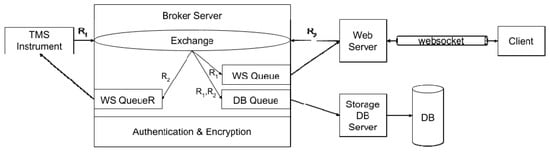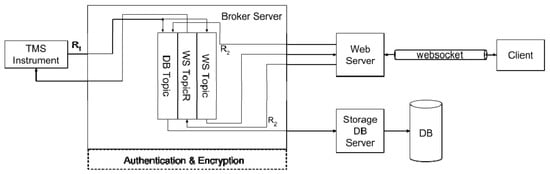 Figure 3 and Figure 4 show the detailed architecture of the proposed framework when the AMQP and MQTT protocols are considered, respectively. For sake of generality, message storage is provided outside the broker by means of an additional database (DB), generally located in the cloud. Similarly, an authentication/security manager is in charge of handling keys and certificates. As stated before, AMQP and MQTT leverage queues and topics for relaying messages to consumers; per each TMS instrument, a set of three queues/topics is provided: the DBQueue/Topic is for storing all the message in the storage DB; the WSQueue/Topic and the WSQueueR/TopicR are for websocket exchanges. In this work, MQTT is considered as a reference implementation, due to its simplicity and wide diffusion; AMQP is considered as the actual viable solution, due to its higher flexibility and scalability.