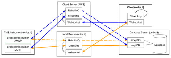 The experimental setup is depicted in Figure 7. There are five main actors involved in the experiments. The designed experiment requires a message starting from the TMS Instrument to travel toward the Client, being saved also in the database; in the Client, a loopback mechanism triggers the sending of a command message that travels back to the TMS Instrument, activating the saving action inside the database as well. AMQP and MQTT Brokers are implemented using open source solutions, RabbitMQ (version 3.7.8) and Mosquitto (version 1.5.3), respectively. They have been chosen due to their diffusion and availability for many different platforms. RabbitMQ is written in Erlang and has been developed within the Open Telecom Platform framework for failover and clustering. RabbitMQ natively supports AMQP-0.9.1 as the core protocol and offers a gateway for HTTP enabling a management plugin, mainly for diagnostic purposes, other than supporting messaging services toward a browser based on STOMP over websocket and JSON-RPC. Mosquitto is an Eclipse project; it implements MQTT version 3.1.1 and it is written in C. It has been mainly designed for satisfying lightweight messaging applications, especially when computational capabilities are scarce.