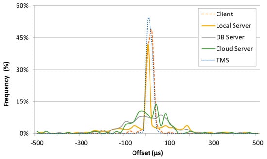 To calculate the metrics defined in the previous section, a synchronization mechanism between all the devices/machines involved in the distributed system is necessary. In this paper, the NTP synchronization is used. It is periodically executed in every device and the local system clock is corrected using the offset and delay measurements from a global NTP server, which is, in turn, synchronized to the UTC source. The uncertainty of the time synchronization using NTP varies with the quality of the Internet connection in terms of latency, and it is typically on milliseconds scale [] The NTP daemon transparently calculates and applies corrections, logging error statistics when requested. In this paper, the synchronization uncertainty has been evaluated using the residual offset of the system clock at step N, which is the residual error after the clock corrections calculated at step N-1 have modified the local clock behavior. The results are shown in Table 1 and Figure 8 for a one-day observation time, compatible with the observation time used to evaluate the experiments.