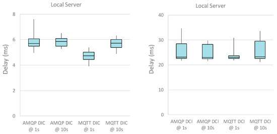 The experimental setup is easily configurable to change the message protocol (AMQP or MQTT) and the location of the Server. As shown in Figure 7, the AMQP scenario is based on the AMQP blocks inside the actors, with the dashed lines showing the message exchange paths. On the other hand, the solid lines connect the MQTT blocks for the implementation of the MQTT scenario. The local and cloud scenario are denoted by different line color: orange for Local Servers, blue for Cloud Server. In all the experiments, default configuration of Brokers is considered, if not explicitly stated otherwise; due to the previously highlighted constraints, message size is set to 2 KB, representative of typical information transferred per diagnosis protocol, as stated in Section 4.2.