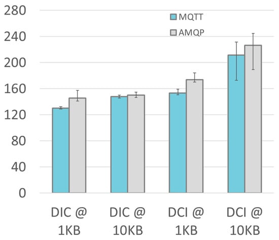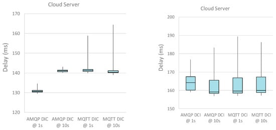 Another experiment has been designed to understand the relation between the size of the exchanged information and the end to end delay. In this experiment, the DIC and DCI metrics have been considered in the case of cloud server (which is the most demanding). The results for size varying from 1 KB to 10 KB are graphically presented in Figure 11. As expected, the size of data has a direct impact on the DIC and DCI. The delay grow is higher for MQTT when the size increases, whereas the variability is almost the same between AMQP and MQTT.