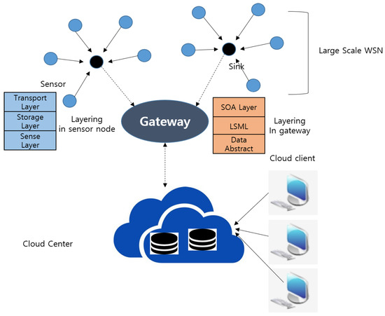 In this research area, most work is conducted by proposing either network architectures or communication protocols. First, the authors propose structural construction of the WSN based on big data processing called service-oriented architecture and virtualization cloud for WSN (SVC4WSN) [23] and simulates it numerically through comparison with multi-hop direct forwarding for local wireless sensor network (MDF4LWSN) architecture. The SVC4WSN consists of four layers: a large-scale WSN, gateway, cloud center, and users (as shown in Figure 5). In this architecture, there are two critical issues: congestion caused by the big data, and communication latency. To deal with these issues, flexible and multi-layer data processing and storage models based on cloud computing are proposed.