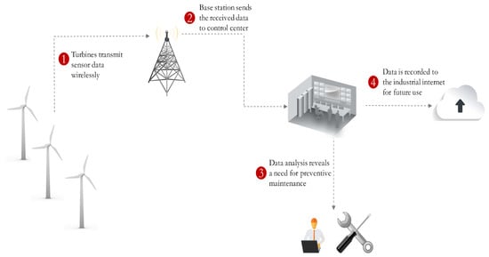 In general, wind farms are situated in remote locations and thus the control centers are typically located several hours away from the wind farms. Remote data communication connectivity through the Internet in the form of an IoT network can help the control centers to monitor the state of a wind turbine and to control a wind turbine’s operation. Due to the remote location of wind turbines, the IoT network connectivity requires wireless networks such as cellular or satellite networks. An integrated scenario comprised of wind turbines and a wireless IoT network [] is depicted in Figure 1.