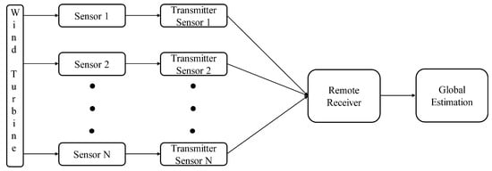 Demand for renewable energy is rapidly increasing in order to counteract progress of global warming and diminishing natural resources. Wind turbines play a significant role in renewable energy generation. It is predicted that wind farms, consisting of many wind turbines, will supply about 10% of total electricity by the year 2020 [,]. Usually, wind turbines are placed in remote areas where plenty of wind is available. Examples of such places are off or near the seashore or on mountains. For maintenance and monitoring purposes, various sensors are embedded into a wind turbine to measure the state of the turbine. However, convenient monitoring of the state requires remote communication connectivity to the wind turbines. A viable solution to this problem can be an Internet of Things (IoT) based network [,,]. Integration of the wind turbines into an IoT network can enable a real-time monitoring system to monitor turbine performance and detect faults so that technicians can take necessary actions promptly. As communication links between the wind turbines and the Internet will likely take place over wireless communication channels, a reliable communication framework is required between the wind turbines and wireless base stations or access points connected to the Internet. On top of that, to process and combine the multiple sensor readings, a fusion algorithm needs to be developed for accurate state estimation while taking into account the uncertainty of the wireless channel.