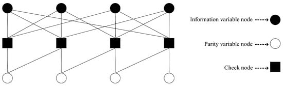 Low-density parity-check (LDPC) codes are best known for their capacity approaching performance and low complexity decoding property [,]. Repeat accumulate (RA) codes are a special type of LDPC codes which inherit the above properties while allowing low encoding complexity [,,]. Similar to the LDPC codes, RA codes can be represented by a bipartite graph with K information variable nodes, M parity variable nodes, and M check nodes. Each information node represents an information bit, while each check node represents a check equation satisfying the condition that the modulo 2 sum of all the connected nodes will be zero. The value of each parity node, which represents a redundant/parity bit, is generated such that the check equation satisfies the above condition. In an RA code, each information node is connected to more than one check node, while each parity bit node has connection with exactly two check nodes (except the last parity node, which connects to only one check node). We connect the parity bit nodes and the check nodes such that the parity bit node always connects with the check nodes at position and . The parity/redundant bits or the value of the parity nodes are generated in the following manner. The parity bit node’s value is calculated by performing modulo-2 sum of the information bit nodes that have connection with the check node and the parity bit node. A RA code is referred to as -regular code, when each of the information bit node is connected with exactly q check nodes and each of the check nodes is connected with exactly a information bit nodes. A Tanner graph representation of a regular RA code is depicted in Figure 3. Note that a Tanner graph is equivalent to a binary matrix of size , where each column and row represent variable and check nodes, respectively and each non zero entry represents a connection between the corresponding variable and check nodes.