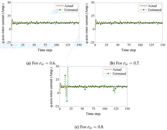 where is the state of the induction generator, is control input, is a constant matrix, and is process noise. We model the process noise as Gaussian noise with zero-mean and covariance matrix . In , and are the stator currents in the d and q axes, respectively; and are the rotor currents in the d and q axes, respectively. In , and are the stator voltages in the d and q axes, respectively; and are the stator voltages in the d and q axes, respectively. With the specifications of a single-cage induction generator, and are characterized by [,],