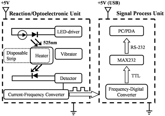 The major objective of this prototype was to develop a low-cost portable colorimeter with a heat-resistant disposable strip, in order to obtain an easy-to-use piece of equipment intended for lay-personnel in analytical chemistry technology. Figure 1 illustrates a block diagram of the overall instrument design with a circuit. The two main components of the hand-held instrument are the reaction/optoelectronic and the electronic signal-processing units. The schematic diagram also describes the transformation of the signal from a light signal to a frequency-modulated signal and then to digital information feeding into the microprocessor (PC/PDA). Our previous work [35] revealed that the combination of a photo-detector with frequency-modulated digital output and a frequency-digital converter are cost-effective and easy to implement. The following sub-section describes the design and fabrication of disposable strips, as well as the heat/spatial configuration to support the light pathway. The later paragraphs describe in detail the two principal components of the device, and elucidate all aspects of their operation.